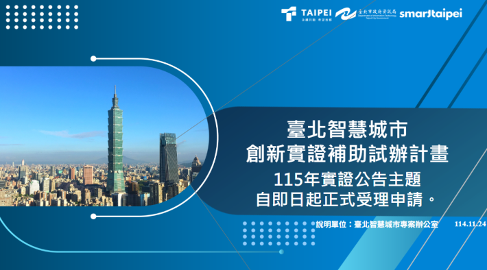 一、依據:「臺北智慧城市創新實證補助試辦計畫」辦理。二、受理時間:自公告日起至12月22日(一) 下午4時截止。三、申請方式:以親送或掛號郵遞方式提出之申請文件,須於截止期限前送達 TPMO臺北智慧城 ...更多